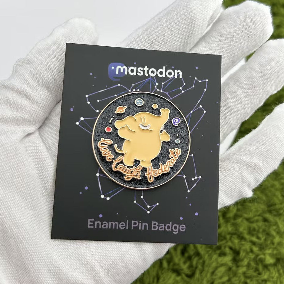 Find your fellow fediverse enthusiasts in real life by wearing this soft enamel pin featuring the Mastodon mascot with a shiny copper finish and glitter effect.