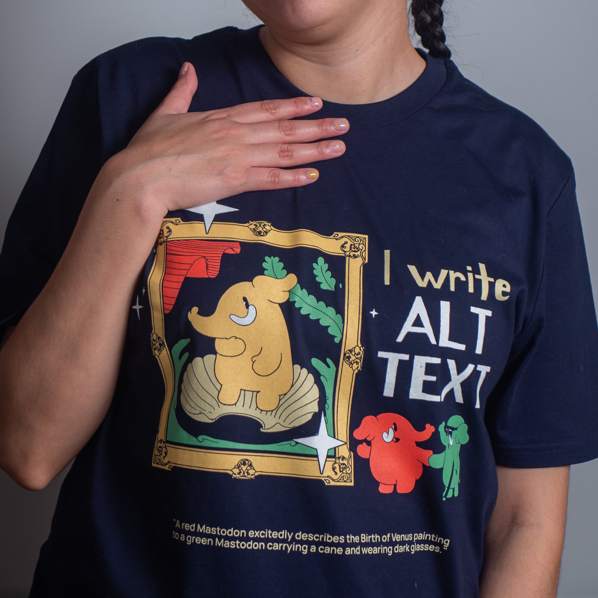 An organic cotton t-shirt with a great feel, screen printed in 5 vibrant colors. Writing alt text for images and videos helps people with low or no vision participate in the community. But even for sighted folks it can help provide valuable context, not to mention make your posts easier to find in search.